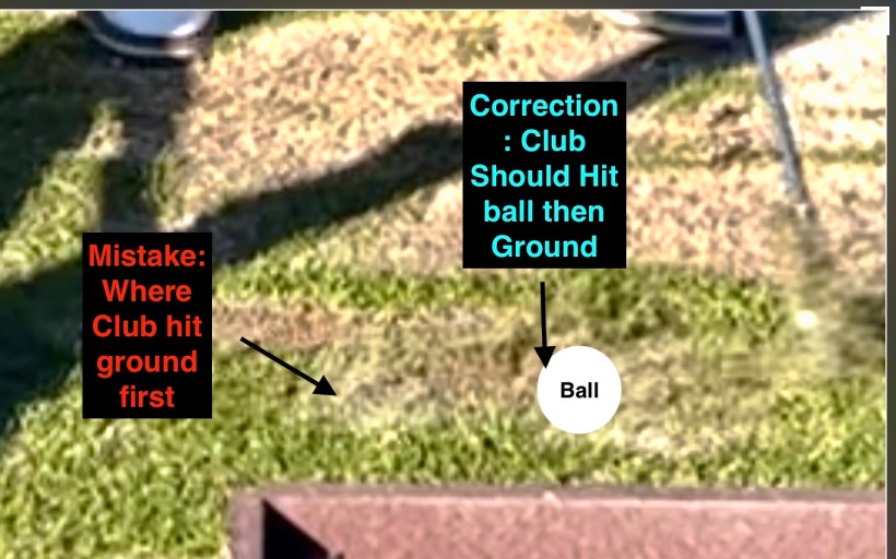 Usually, the reason you hit the ground before the ball is that you have NOT moved forward towards the ball ENOUGH on your down swing. Now, we should know that on our downswing our hips should move first, then our shoulders, then our hands, then the club. But if the club hits the ground first, then your motion is not in the right order. Such as the opposite order: hands, shoulders, and possibly even no hip turn. Or possibly you have the right timing but you haven’t moved your hips enough forward when swinging through. Therefore the ground gets in the way.